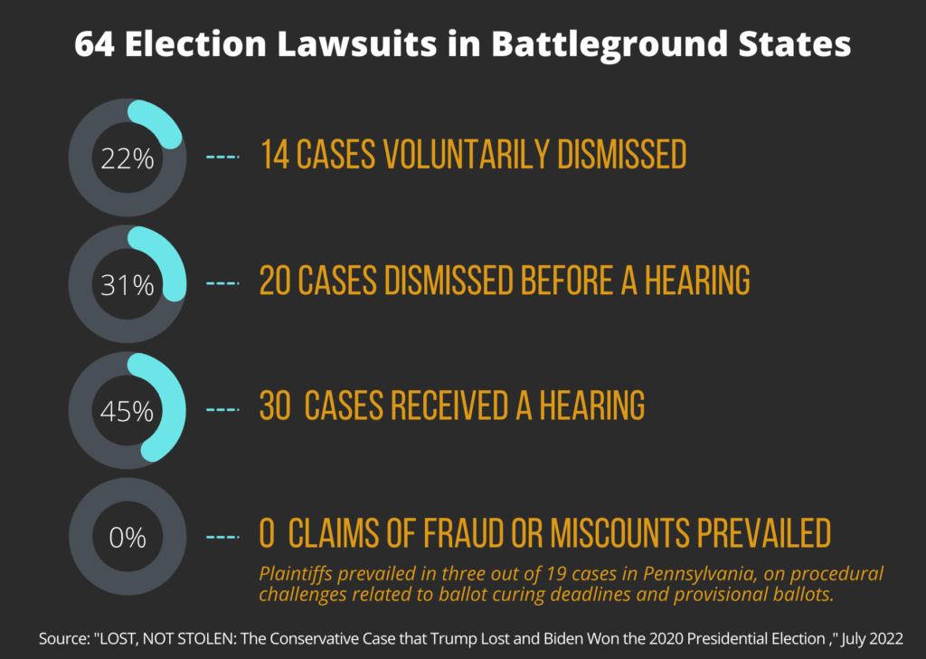 - Of the 64 cases alleging 187 counts of voter fraud, irregularities, corruption, or procedural deficiencies in battleground states: 20 were dismissed before a hearing, 14 were voluntarily dismissed, and 30 had a hearing on the merits. All claims of fraud and miscount failed.